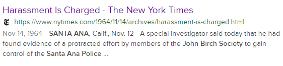 SANTA ANA, Calif., Nov. 12—A special investigator said today that he had found evidence of a protracted effort by members of the John Birch Society to gain control of the Santa Ana Police Department.